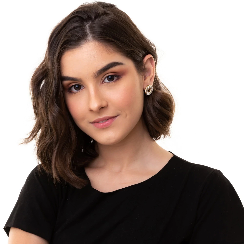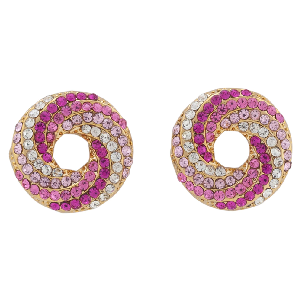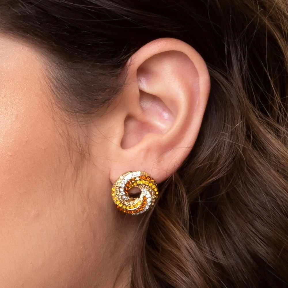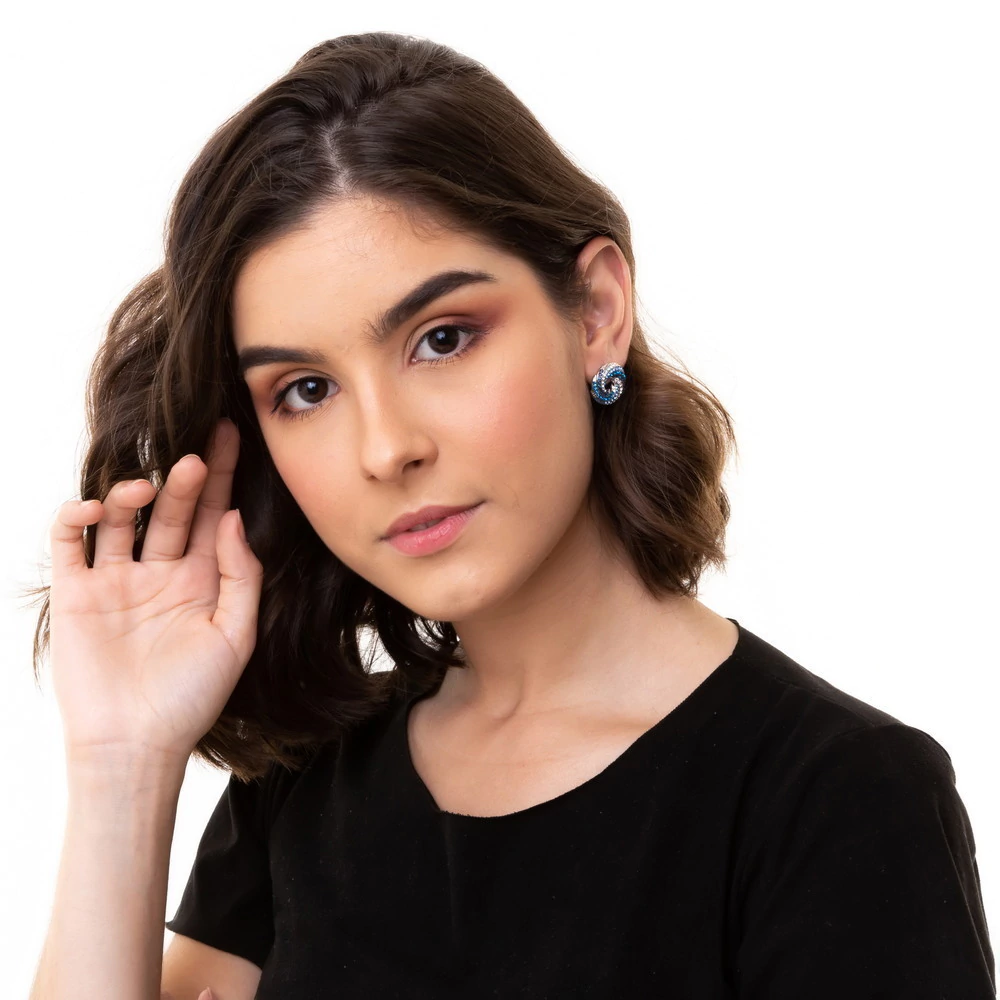 Este par de brincos apresenta um formato circular com um design em espiral que remete a um delicado donut, criando um visual moderno e divertido. A composição é realçada pelo uso de pedras coloridas cuidadosamente distribuídas, que formam um padrão vibrante e harmonioso.