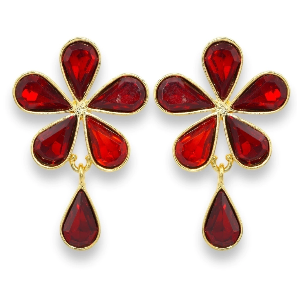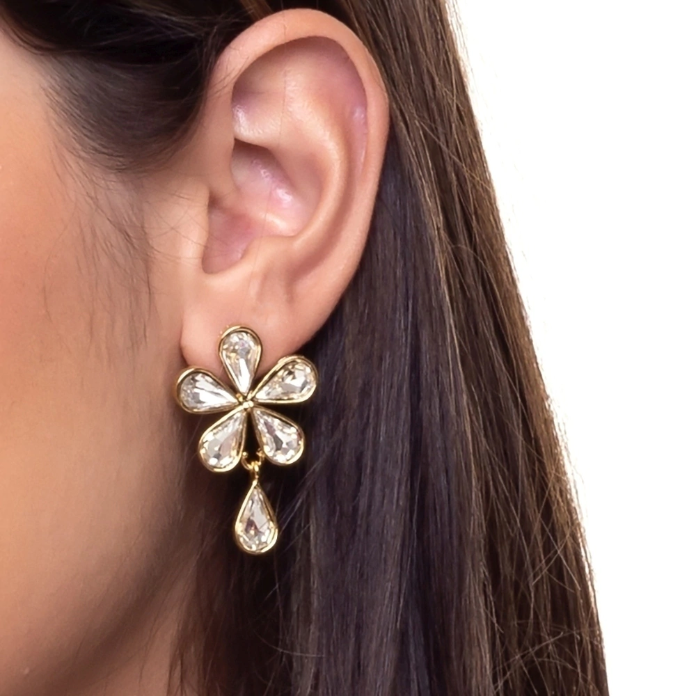 Este brinco elegante traz o design de uma flor estilizada, com pétalas formadas por pedras lapidadas que brilham intensamente. O detalhe pendente, também com uma pedra em formato de gota, adiciona um movimento delicado e sofisticado à peça. A estrutura cuidadosamente trabalhada realça o brilho das pedras, criando um acessório que é ao mesmo tempo clássico e moderno.