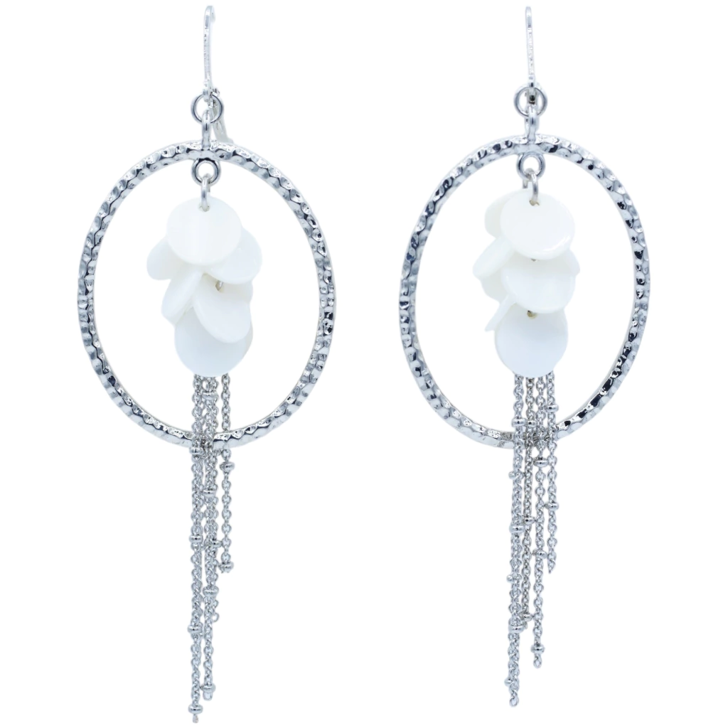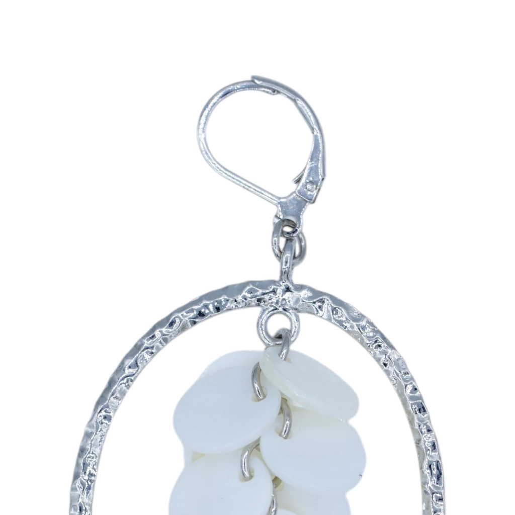 Encante-se com este par de brincos de argola pendentes, perfeitos para mulheres que desejam adicionar um toque de sofisticação e movimento ao seu estilo. Confeccionados em metal prateado de alta qualidade, possivelmente prata, esses brincos brilham com elegância discreta. As argolas apresentam uma textura martelada que confere um charme artesanal, enquanto os detalhes de discos brancos sobrepostos e as delicadas correntes pendentes criam um efeito fluido e moderno, ideal para destacar sua feminilidade em qualquer ocasião.
