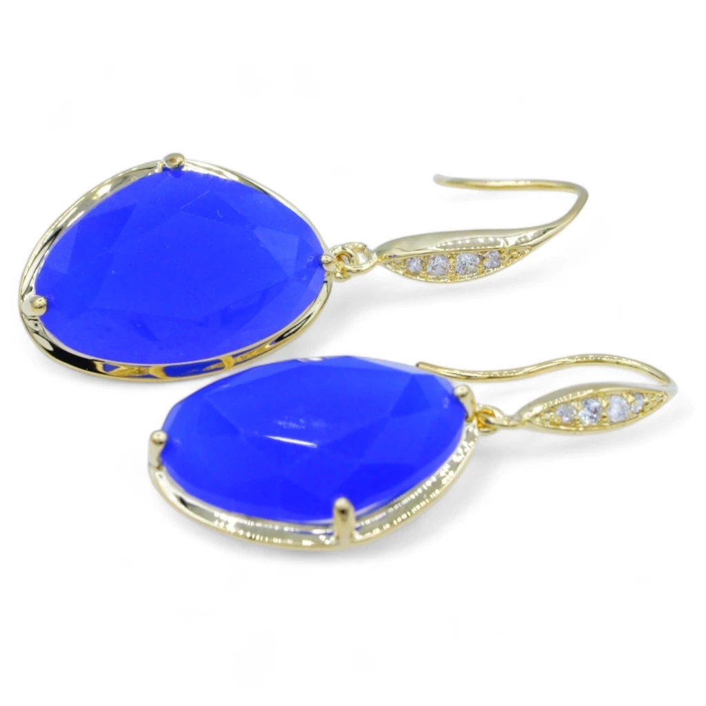 Este par de brincos traz um design marcante e sofisticado, com pedras ovais facetadas em tom vibrante, envoltas por uma estrutura metálica delicada que contorna suavemente cada pedra. O brilho da lapidação acentua a intensidade da cor, criando um efeito visual elegante e moderno.