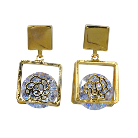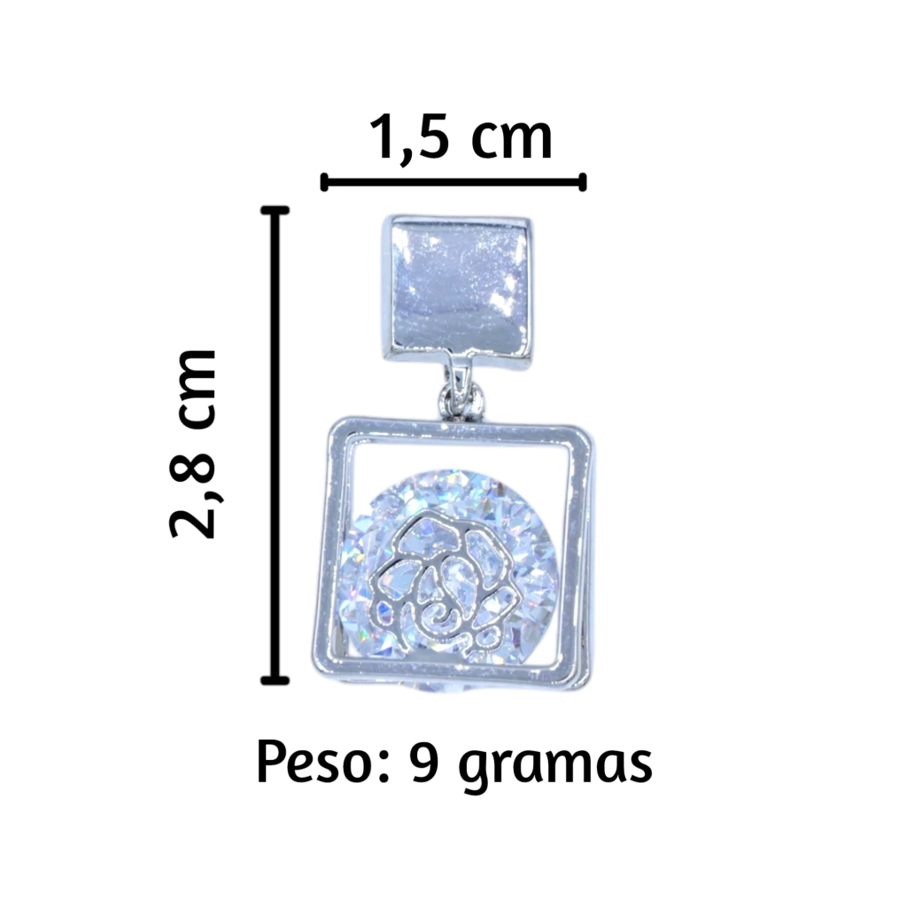 Esses brincos têm um visual moderno e encantador, unindo formas geométricas com elementos delicados. A parte superior apresenta uma base quadrada lisa e polida, que sustenta um aro quadrado vazado em posição levemente inclinada, criando um visual assimétrico e contemporâneo. No centro do quadrado, um cristal redondo facetado ganha destaque e é adornado com uma delicada estrutura em formato de rosa, que dá um toque romântico e sofisticado à peça.